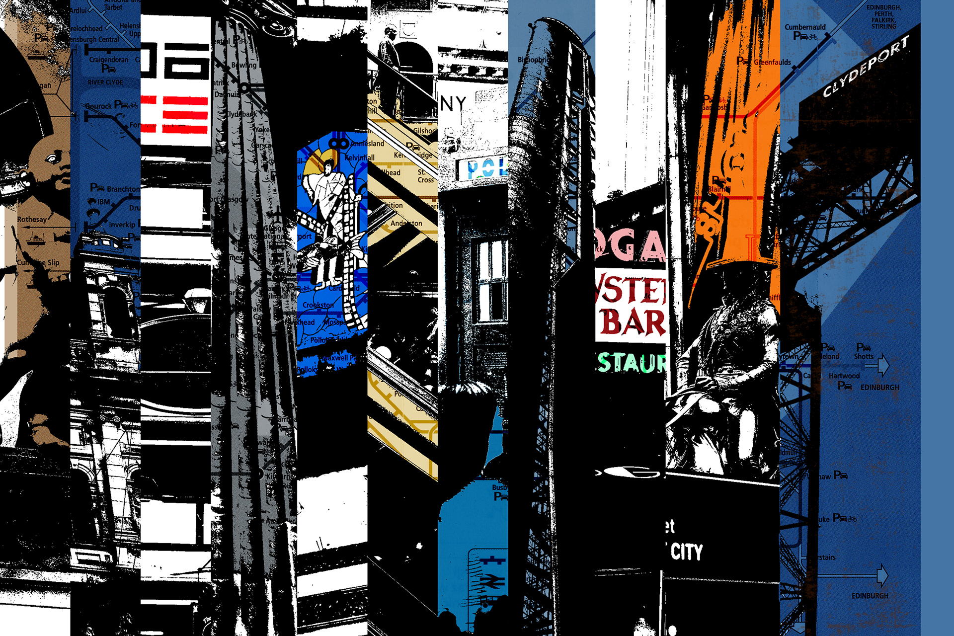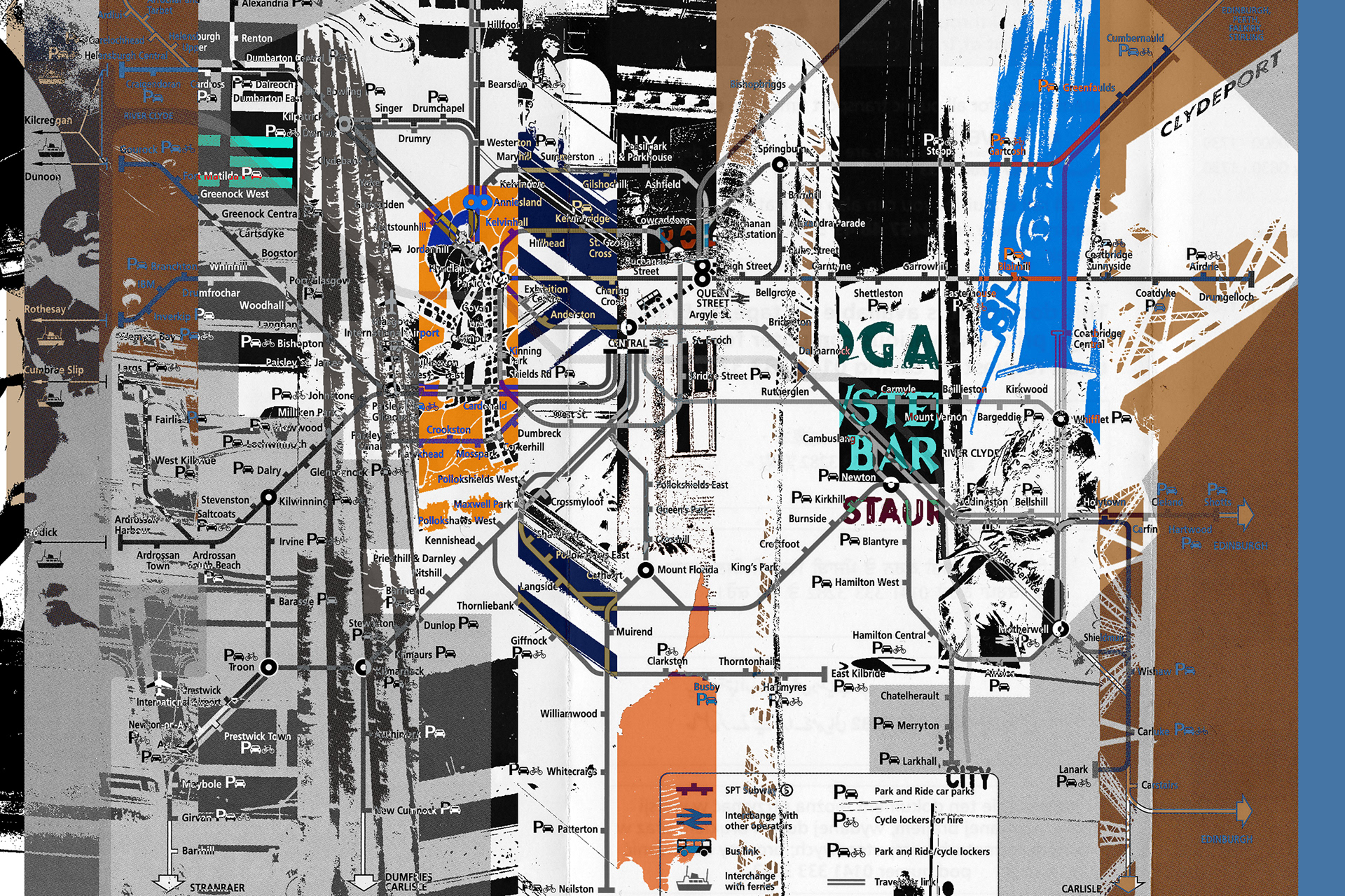 Elements of Glasgow landmarks overlaid with the Glasgow public transport map. Two treatments.